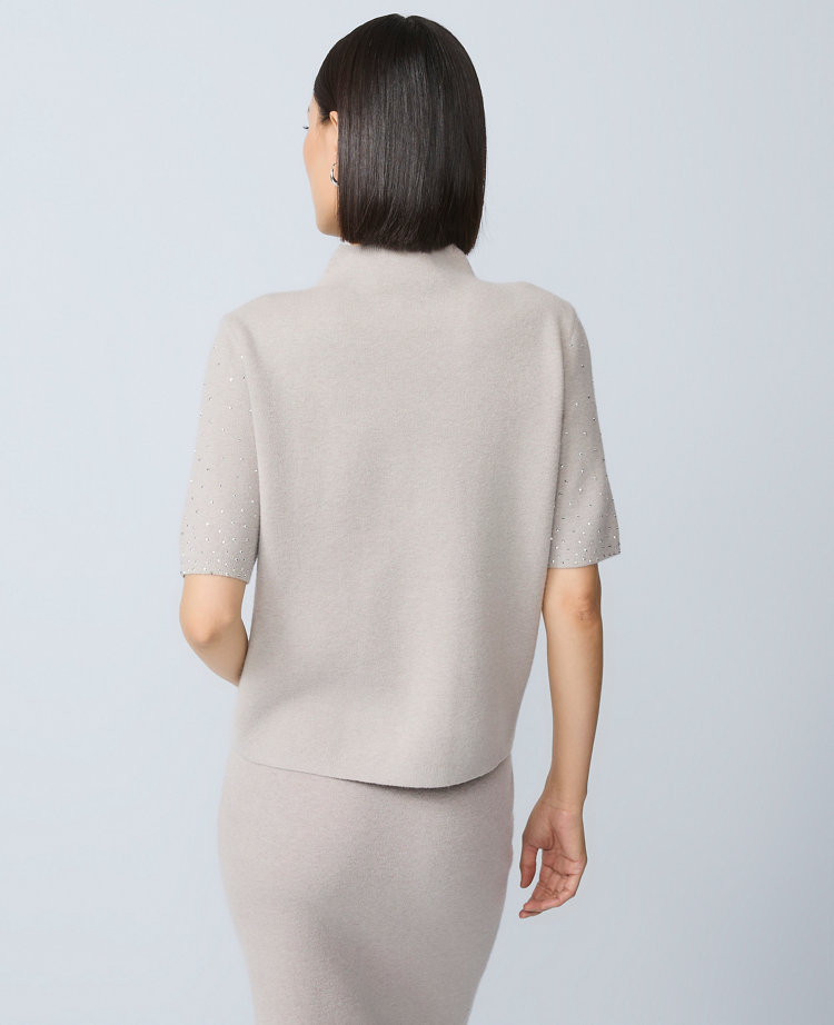 This embellished sweater tee adds a hint of sparkle to both day and night looks. Mock neck. Short sleeves.