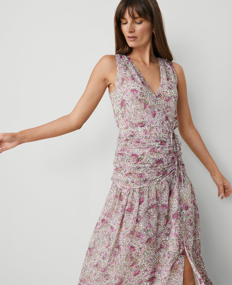 With an hourglass-enhancing ruched waist and fluttering split skirt, this chiffon flare dress is sure to make an entrance. V-neck. Sleeveless. Ties at side waist. Hidden side-zip closure. Side slit. Lined.