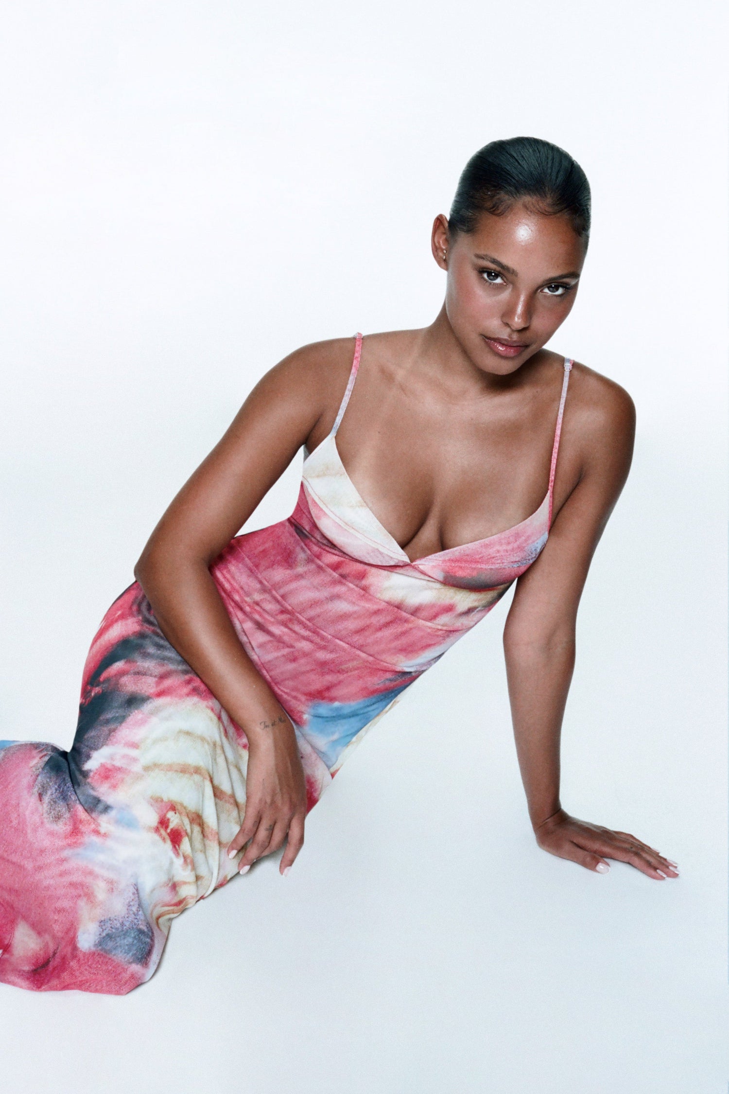 Jasmine is 5’9 and wears a size S. Her measurements are: Bust-34 Waist-23.5 Hips-34.