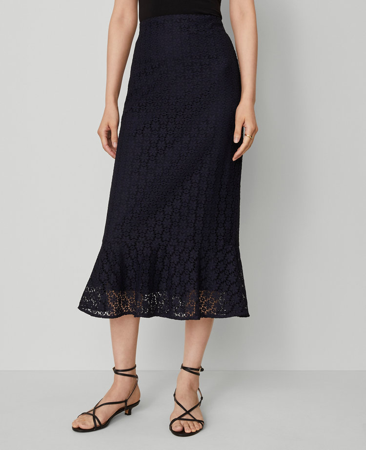 Delicate lace detailing emphasizes the romantic appeal of this feminine midi skirt. Flounce hem. Hidden back zipper with hook-and-eye closure. Lined.