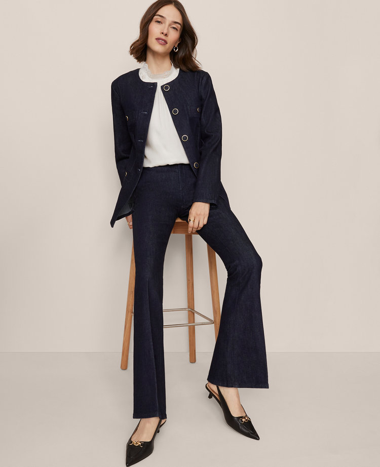 Our mid rise boot cut jeans are both elevated and versatile, thanks to the tailored and flattering silhouette. Front zip with double hook-and-bar closure. Belt loops. Front slash pockets. Back welt pockets.