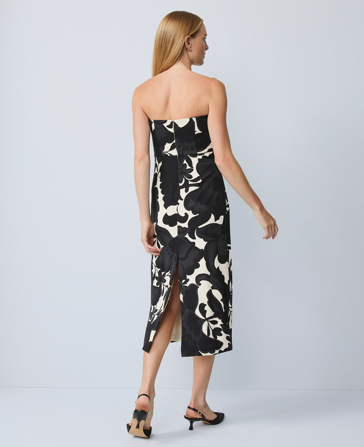 This midi dress boasts a streamlined column silhouette, softened with artful draping along the neckline. Strapless sweetheart neck. Hidden back-zip closure. Removable straps. Back vent. Lined.