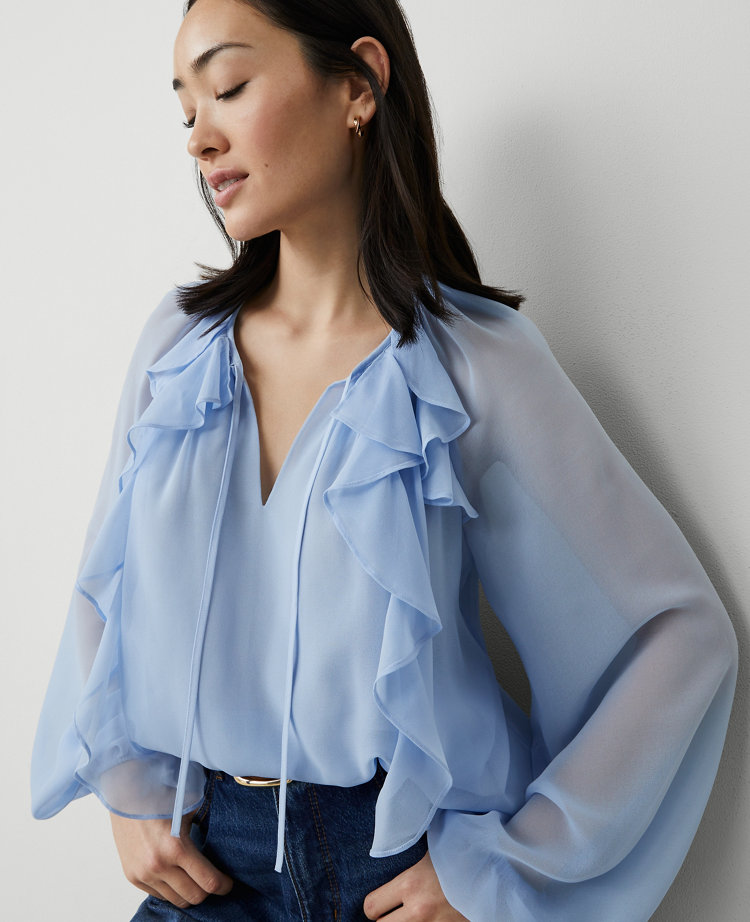 A tie-neck gives this romantic ruffle popover a fresh, feminine update. Round neck with tie keyhole. Long blouson sleeves with elasticized cuffs.