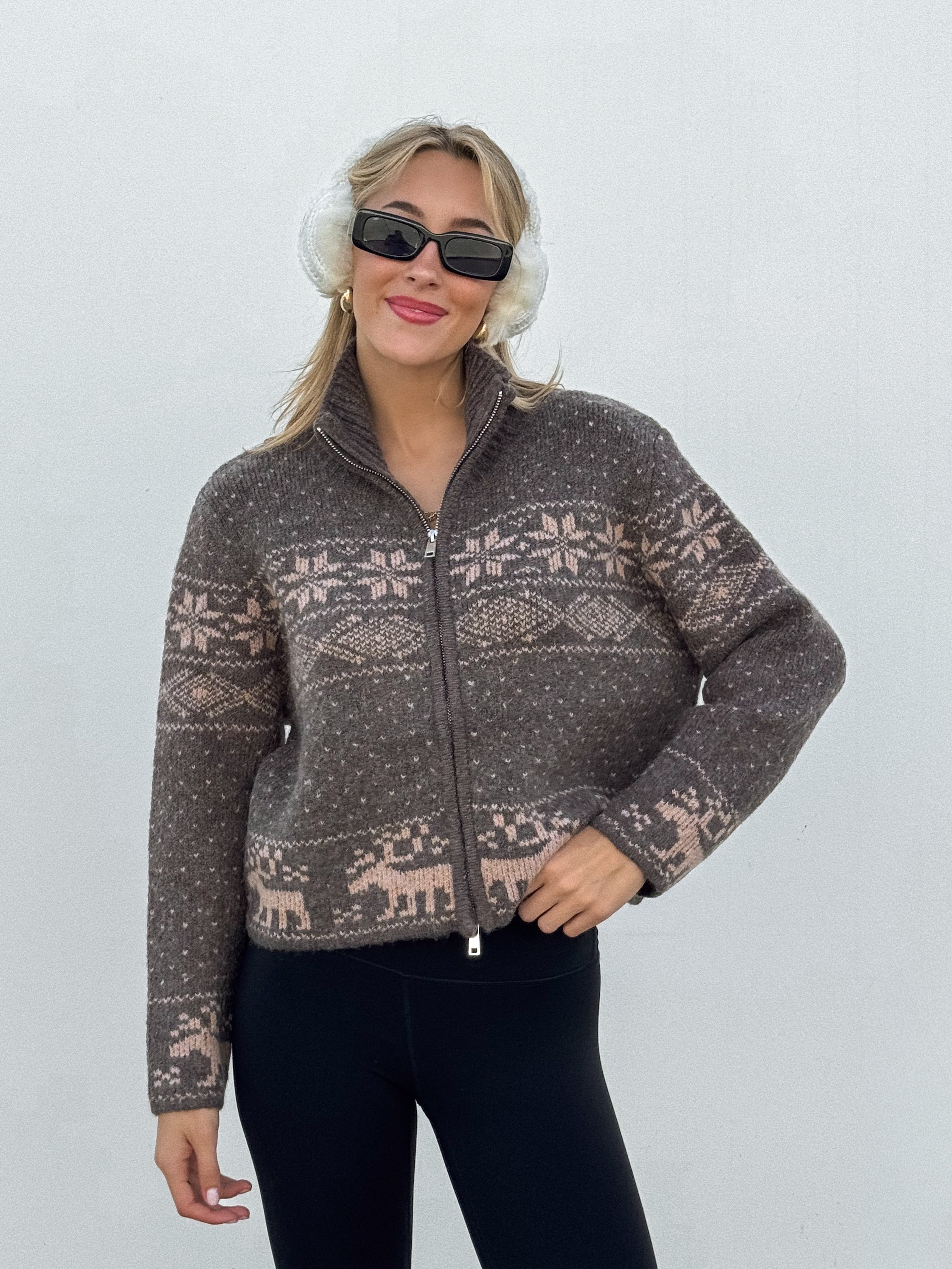 Our favorite winter trend: nordic sweaters. Style our NEW Solace Nordic Knit Sweater with black leggings and black boots for an elevated. comfy look! Complete the look with some sunnies and gold jewelry.