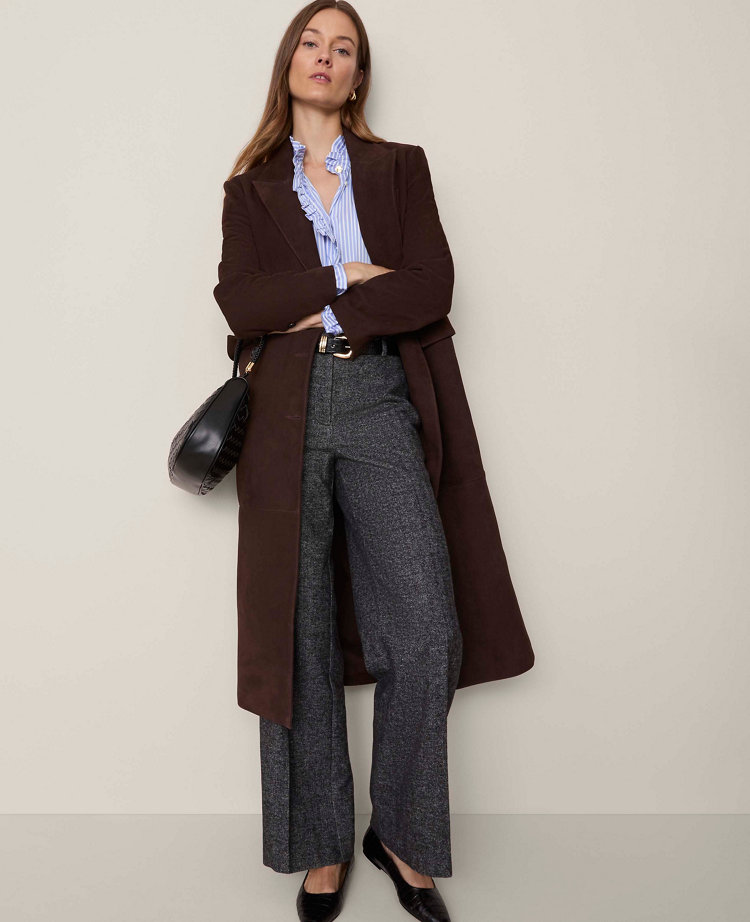 Exquisitely designed with premium fabrics and thoughtful details, this timeless piece will effortlessly elevate your style. Designed in smooth, sumptuous suede, this luxe trench coat is the perfect layering piece between seasons. Notched lapels. Long sleeves with button closures. Removable tie belt. Angled welt chest pocket. Front flap patch pockets. Back vent. Lined.