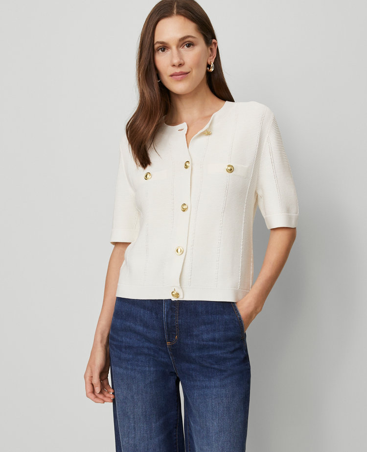 This chic cardigan lends textural interest to anything you style it with. Crew neck. Front button closures. Short sleeves. Front button-welt faux pockets.