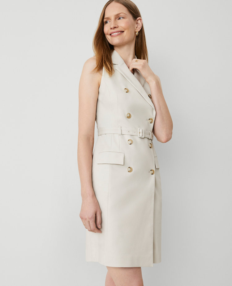Crafted in stretch cotton for a refined, streamlined fit, this tailored halter dress is sure to make an entrance. Halter neck with notched lapels. Double-breasted button front. Sleeveless. Belt loops with adjustable buckle belt. Front flap besom pockets. Lined.