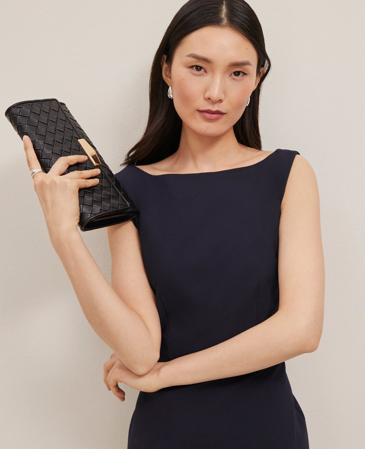 Made in Seasonless Stretch fabric for a streamlined fit, a clean neckline and defined waist bring this feminine A-line dress into sharp focus. Boatneck. Sleeveless. Back zip closure. Lined.