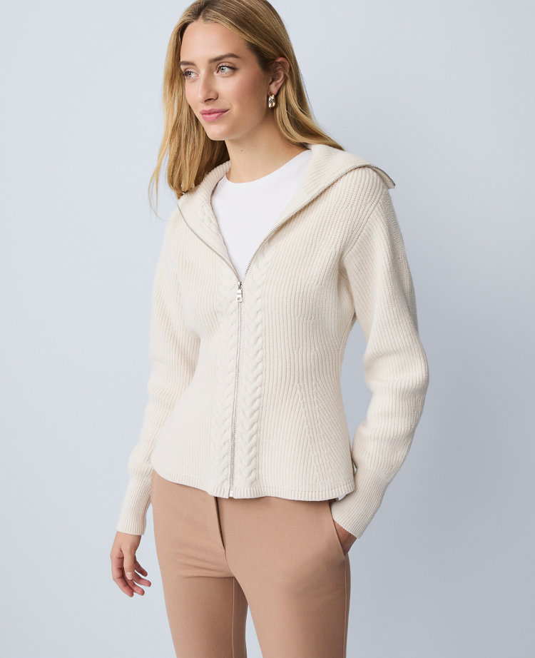 Discover Ann Taylor Weekend. Effortlessly polished pieces for wherever your plans take you. Stay cozy and stylish in this chic cable knit sweater jacket. Ribbed stand collar, cuffs and hem. Front zip closure. Long raglan sleeves.